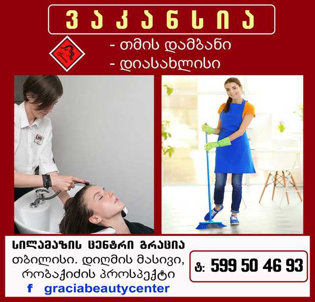 ყველა განცხადება (1)🛑 სილამაზის ცენტრი „გრაცია“ აცხადებს ვაკანსიას დიასახლისის (თმის დამბან - დამლაგებლის) პოზიციაზე.