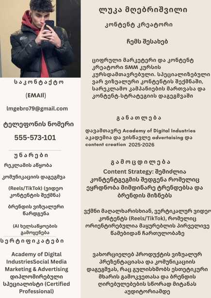 დასრულებული მაქვს სოციალური მედიისა და ციფრული მარკეტინგის კურსები. ვეძებ სამუშაოს კომპანიაში ან სააგენტოში, სადაც შევძლებ პრაქტიკული გამოცდილების მიღებას, განვითარებას და ბრენდის ვიზუალური კომუნიკაციის გაუმჯობესებას